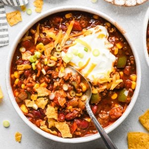 - Serve with your favorite chili toppings like sour cream, green onions, cheddar cheese, and crushed tortilla chips.