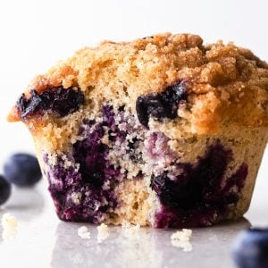 These are the best homemade blueberry muffins with a crumb topping! They are moist and buttery with a perfect crumb and bursting with juicy blueberries. These bakery-quality muffins will be your new go-to blueberry muffin recipe.
