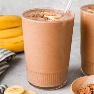 It tastes like a chocolate milkshake, but it’s made with good-for-you ingredients. Naturally sweet bananas, cocoa powder, and a scoop of protein powder blend together into a thick, creamy chocolate and banana smoothie that makes a delicious breakfast or afternoon snack!