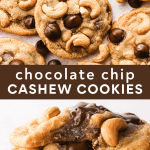 These chocolate chip cashew cookies have chewy edges, gooey centers, a rich cashew flavor, and tons of chocolate chips. They’re bakery-quality cookies with a delicious, nutty twist.