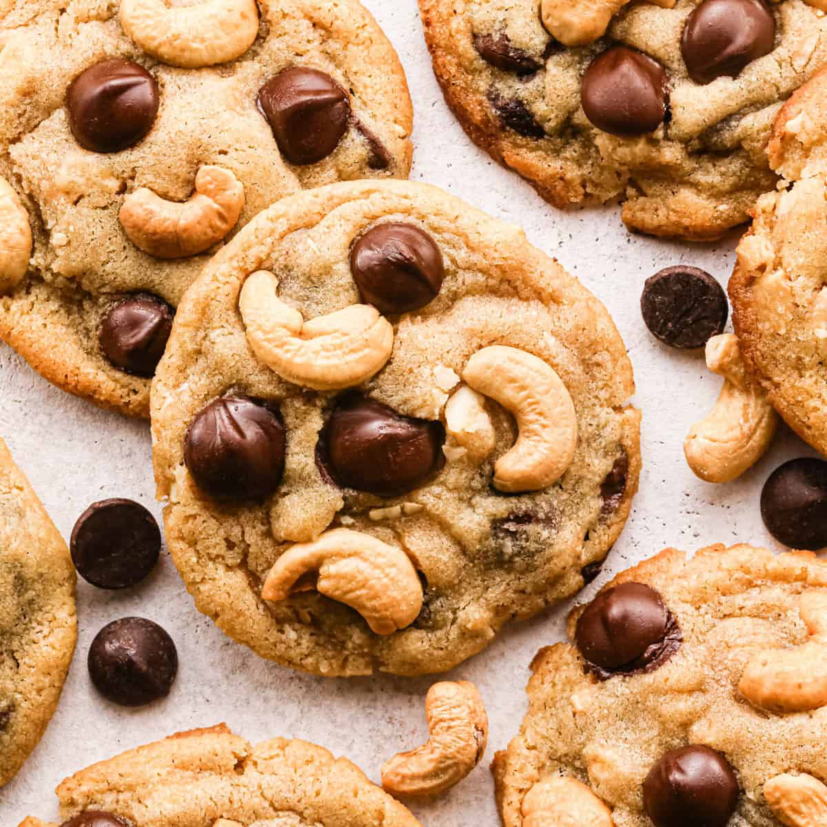 These chocolate chip cashew cookies have chewy edges, gooey centers, a rich cashew flavor, and tons of chocolate chips. They’re bakery-quality cookies with a delicious, nutty twist.