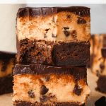 a stack of two cookie dough brownies with a fudgy chocolate brownie on the bottom, edible chocolate chip cookie dough in the middle, and a glossy chocolate ganache on top on parchment paper. Surrounded by other cookie dough brownies and chocolate chips