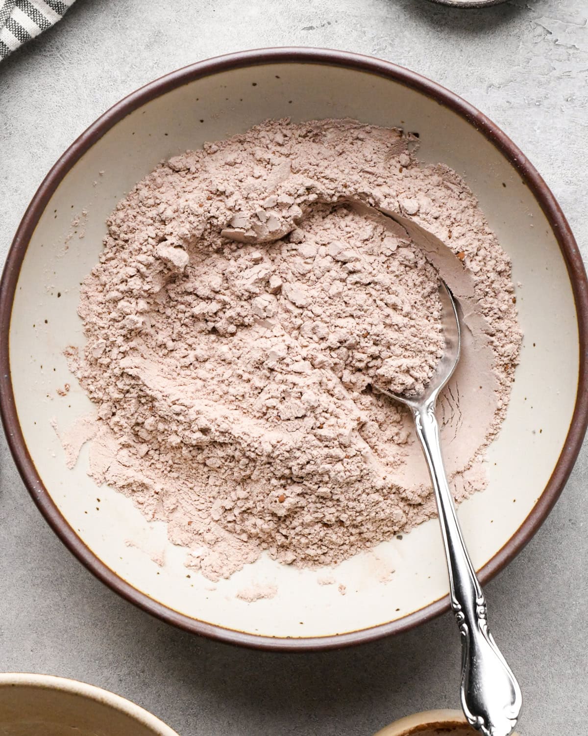 making cookie dough brownies - flour, cocoa powder and salt in a white ceramic bowl with a brown rim before mixing
