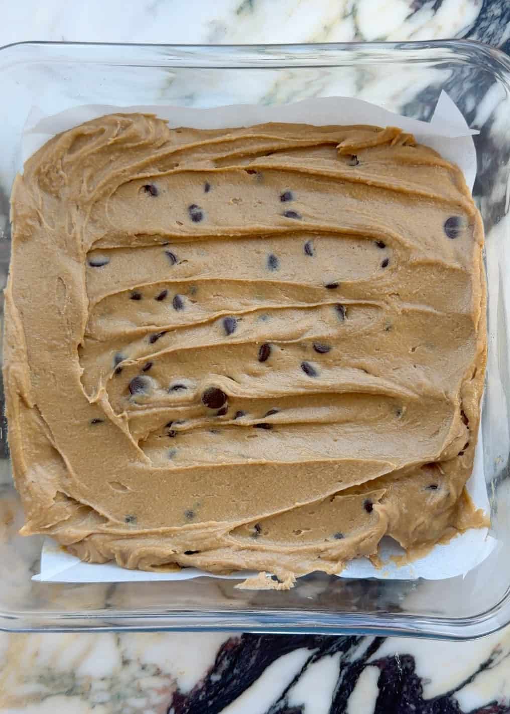 Then, spread the batter evenly into an 8×8″ baking dish. Either line it with parchment paper or lightly grease the baking dish.