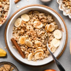 Make Apple Cinnamon oatmeal by stirring in ½ small, finely diced apple, 1 Tablespoon brown sugar ¼ teaspoon cinnamon and a pinch of sea salt into 1 cup warm oatmeal.
