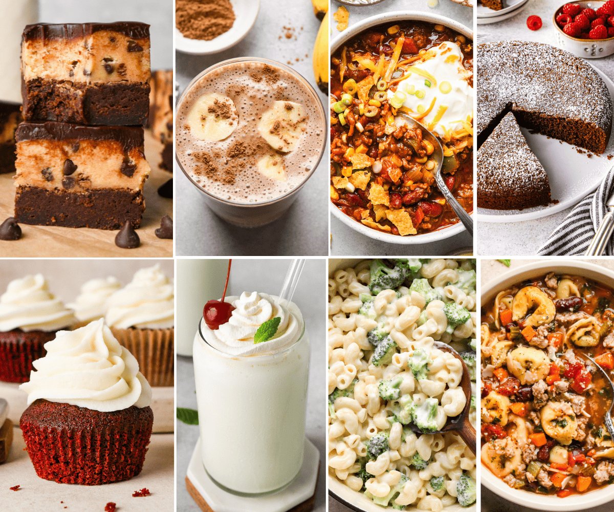 bacon chili | red velvet cupcakes | chocolate olive oil cake | cookie dough brownies | shamrock shake | chocolate banana smoothie | sausage tortellini soup | broccoli mac and cheese