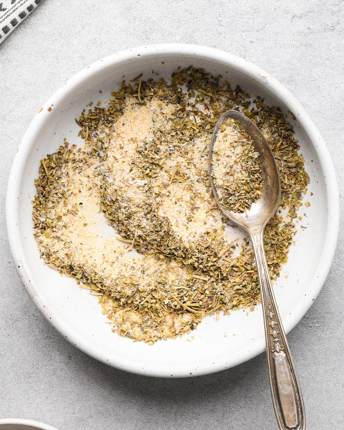 - Combine the Italian seasoning, garlic powder, salt and pepper in a small bowl.