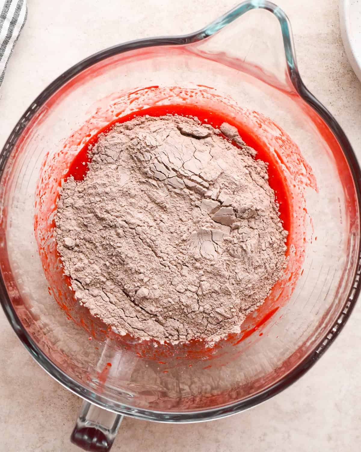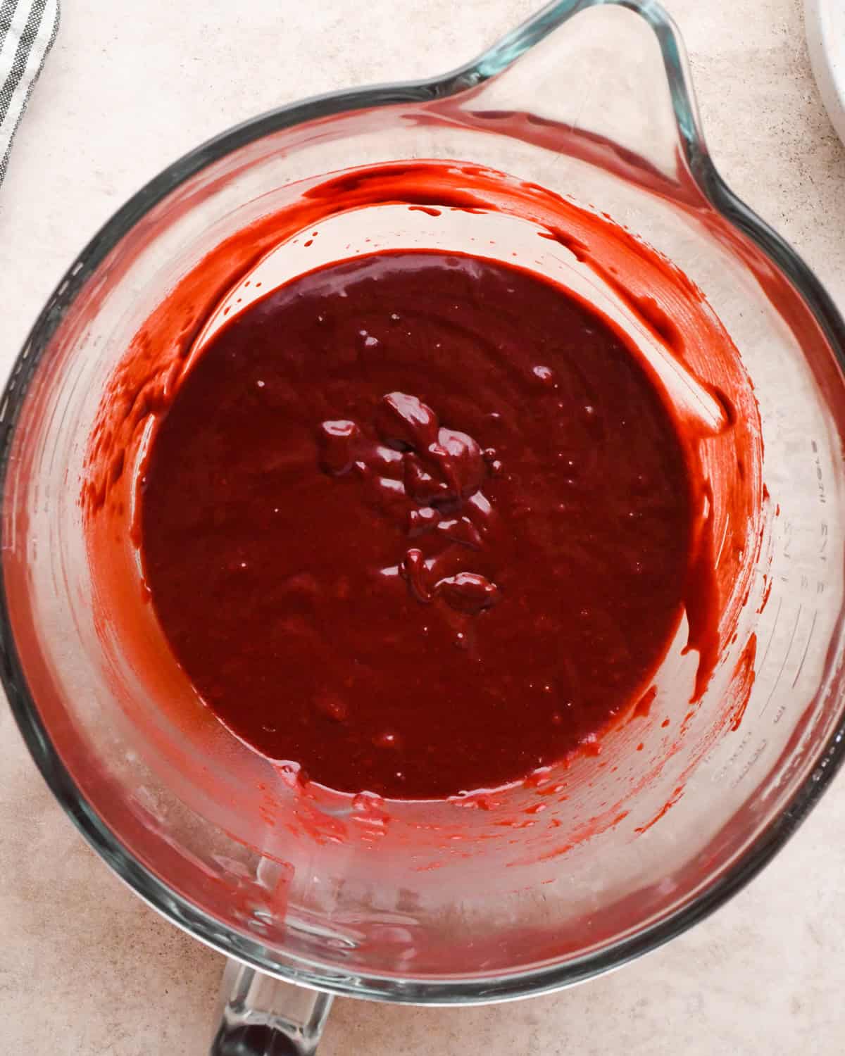 Gel food coloring works best because it gives a vibrant red color without thinning the batter. Liquid food coloring can work but may require more plus extra flour. I suggest this red gel food coloring. Or you can use a natural, plant based red food coloring.