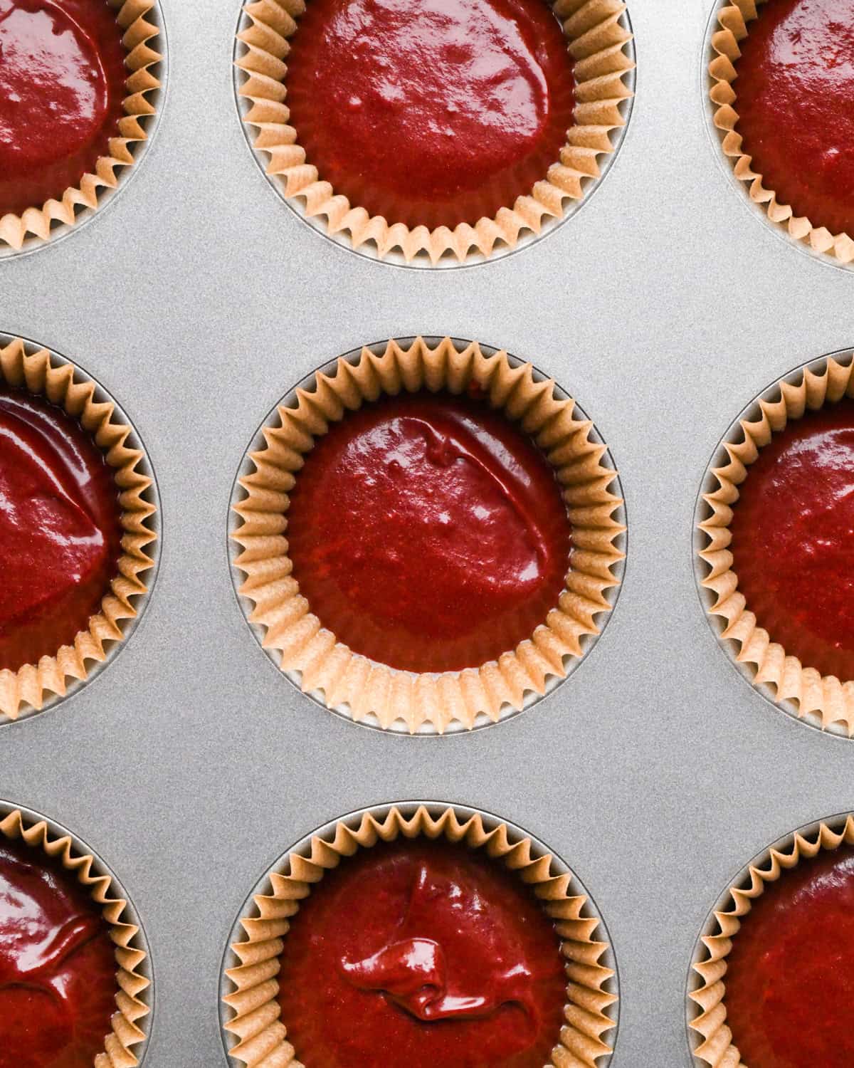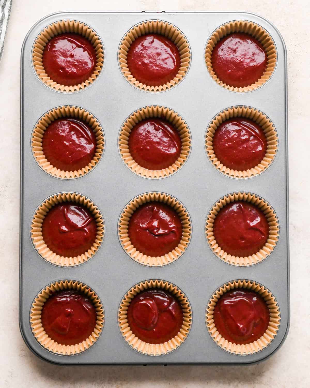 Bake the red velvet cupcakes in the preheated oven for 16-18 minutes, or until the tops are set and a toothpick inserted in the center of the cupcakes comes out clean or with a few crumbs.