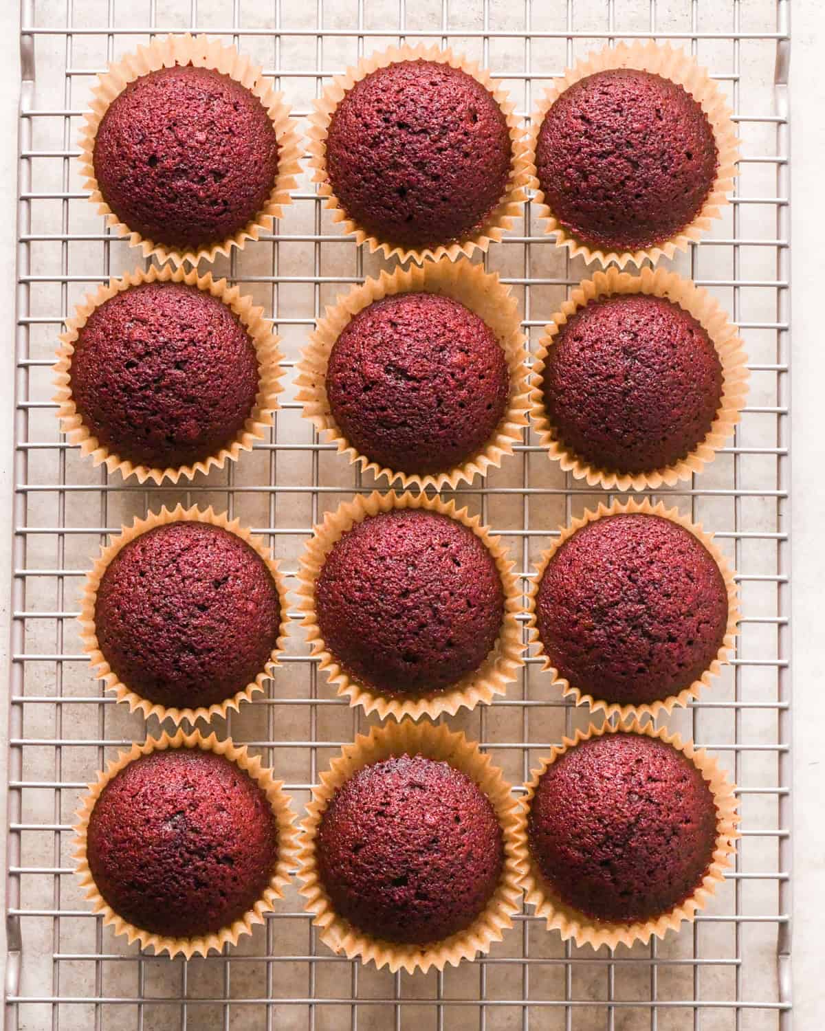 Serve the red velvet cupcakes slightly chilled or room temperature with a glass of milk, hot chocolate, or a latte!