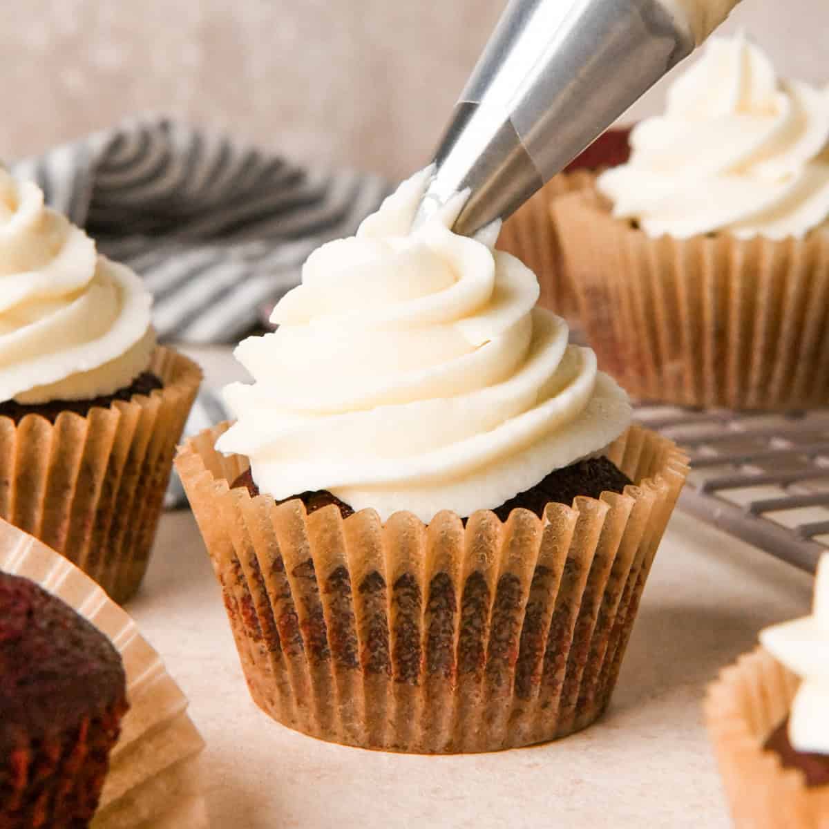 Once the red velvet cupcakes are cool, it’s time to frost them. You can simply spread the frosting on with a knife or spatula, or you can use your favorite piping tip and pipe a design on the frosting. I always use a Wilton 1M tip!
