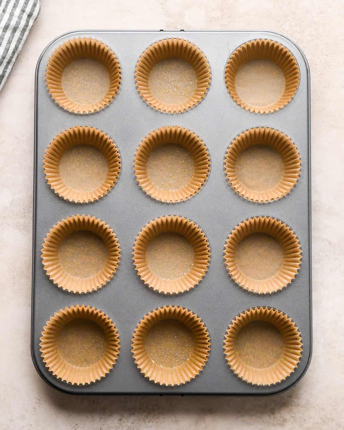 • Line a standard muffin tin with 12 cups and lightly spray with cooking spray. Set aside.