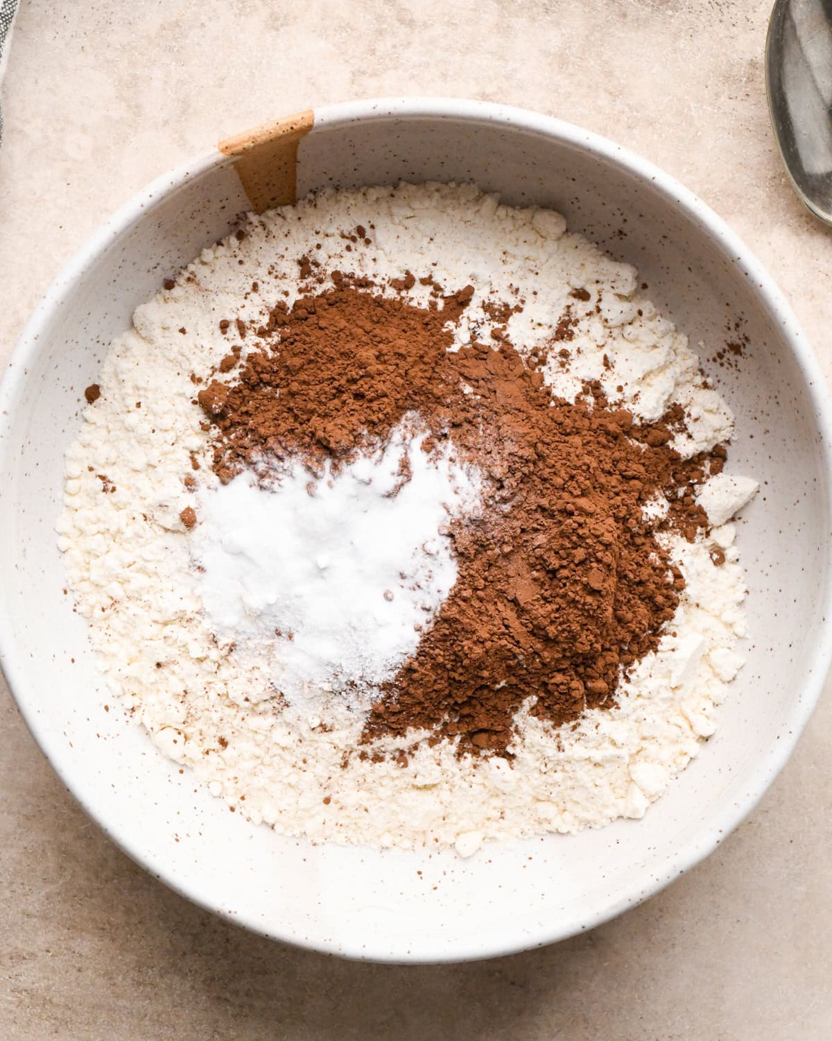 • In a small bowl, combine flour, cocoa powder, baking soda and salt. Set aside