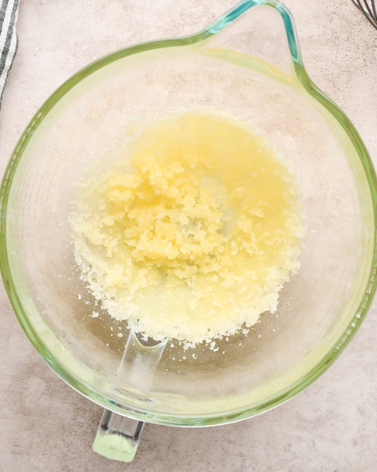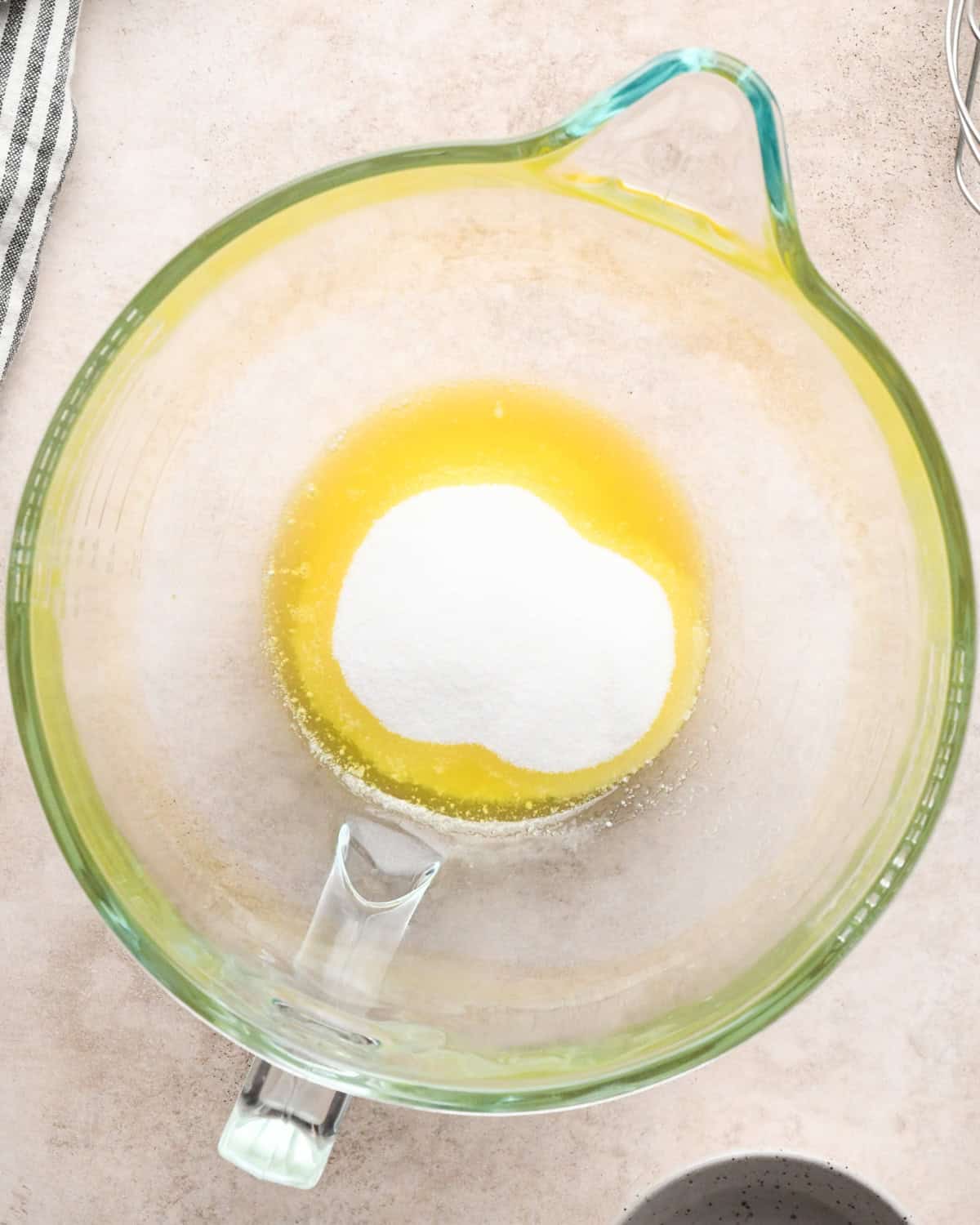 • In a medium bowl, whisk the melted butter and granulated sugar together.