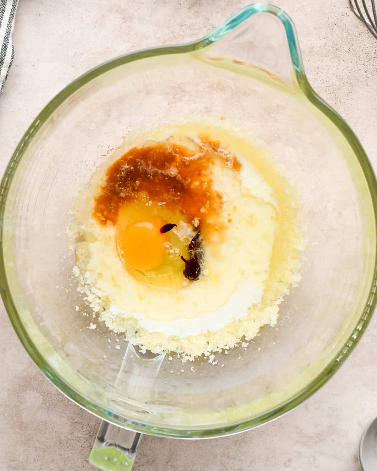 Next, whisk the melted butter and granulated sugar together in a medium or large bowl. I like to do this first because it ensure the butter won’t solidify as it’s mixed with other ingredients.