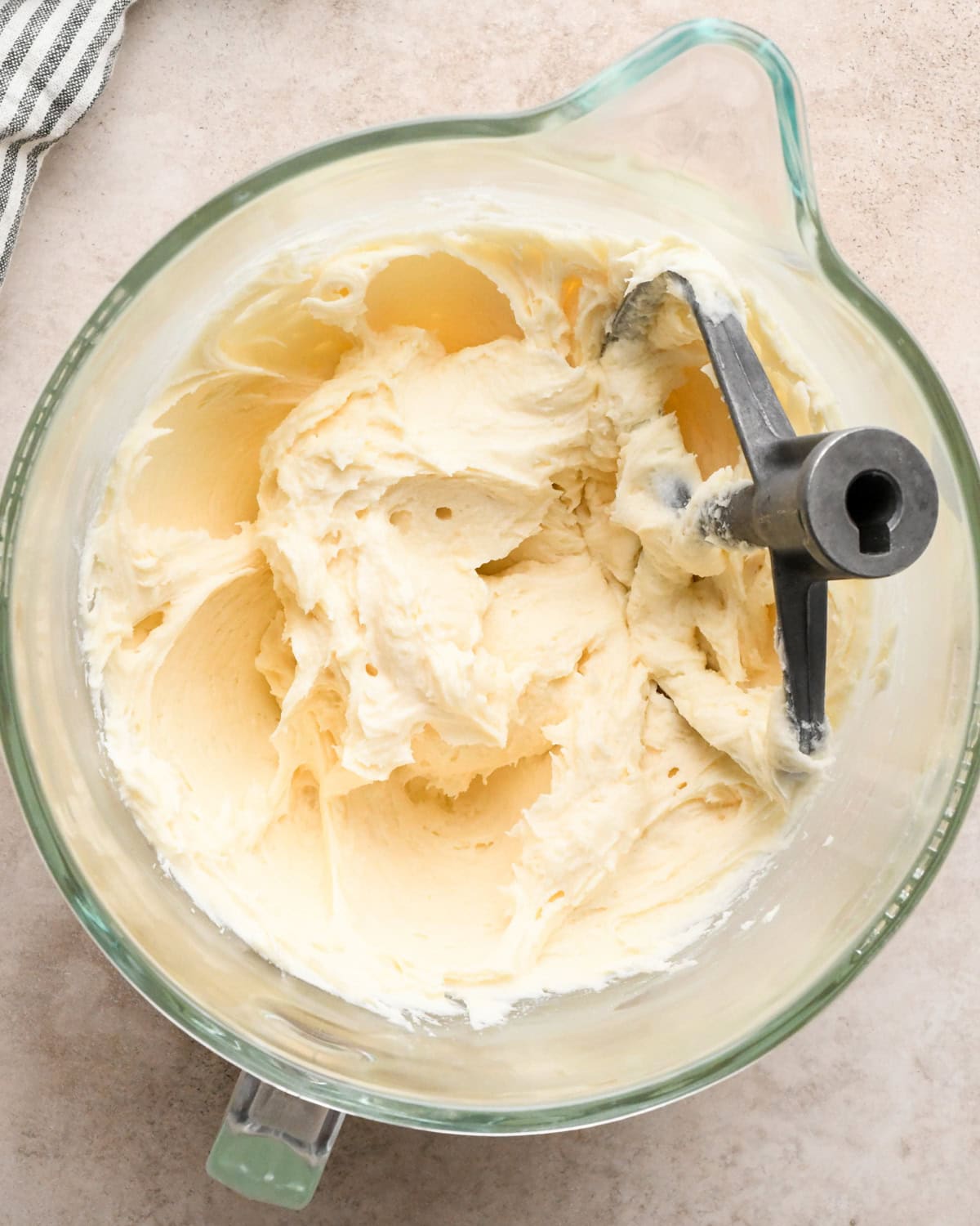 While the cupcakes are cooling, make cream cheese frosting. It’s really easy, just beat the room temperature ingredients together in a standing mixer fitted with a paddle attachment until light and fluffy.