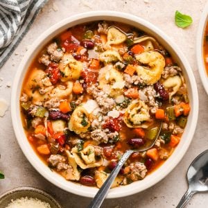 This sausage tortellini soup recipe is easy to make on the stovetop in 30 minutes. Sausage and tortellini soup is a hearty, flavorful soup made with Italian sausage, tortellini, vegetables, beans, tomatoes, and herbs.